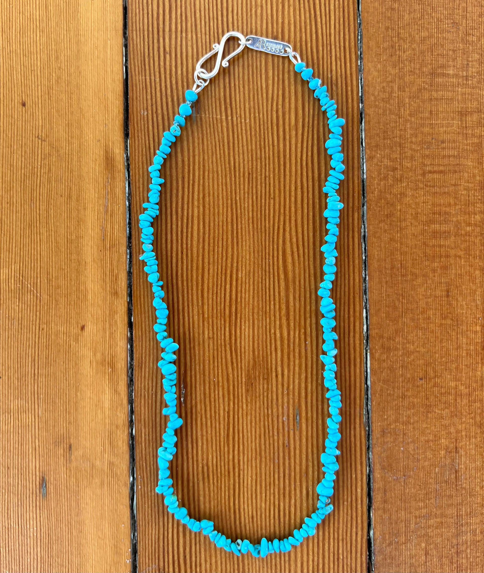 These natural sleeping beauty turquoise nugget beads are strung on silk thread and have a handmade S shape closure.